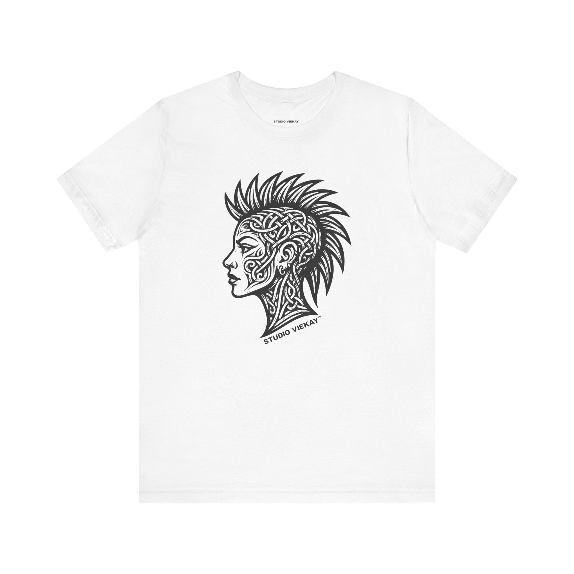 A black and white unisex T-shirt featuring a punk-inspired portrait in Studio VieKay’s sculptural line style. Printed on soft Airlume combed and ring-spun cotton chosen for comfort and structure.